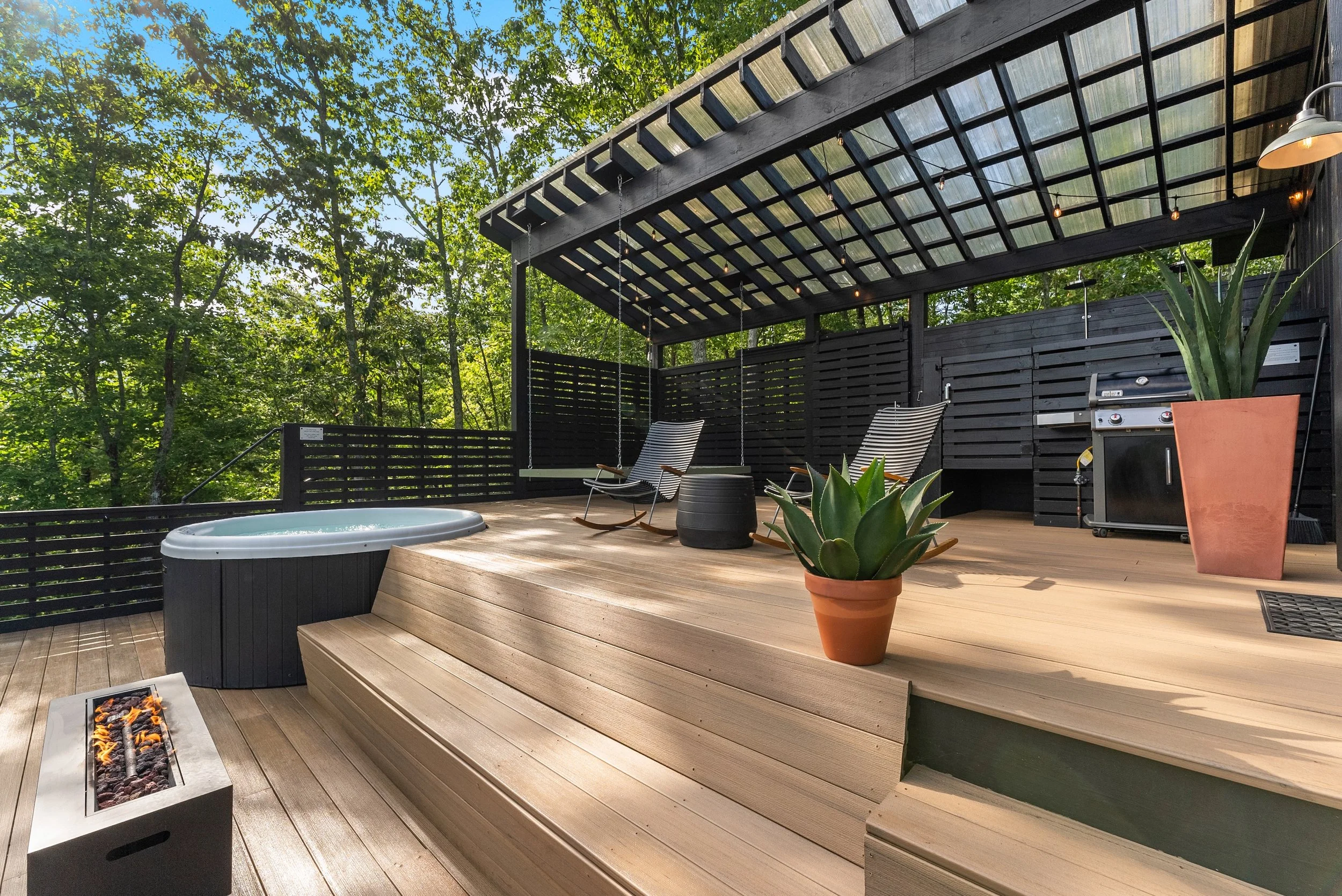 Relax and reconnect in your own private outdoor retreat, featuring a hot tub, outdoor showers, gas fire pit, and floating daybed—perfect for a romantic escape under the stars.