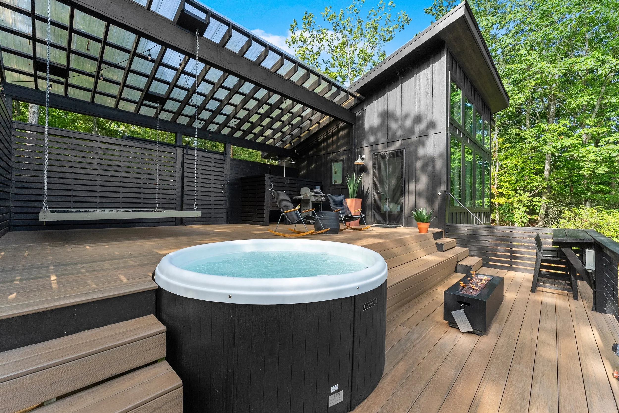 Black Ash is made for moments of true stillness. Soak in the second-story covered hot tub, nap in the built-in deck hammock, or rinse off beneath a skylight-lit indoor shower. With mountain views, a king bed, projector screen, outdoor shower, and gas firepit, it’s an unforgettable escape tucked into the trees.